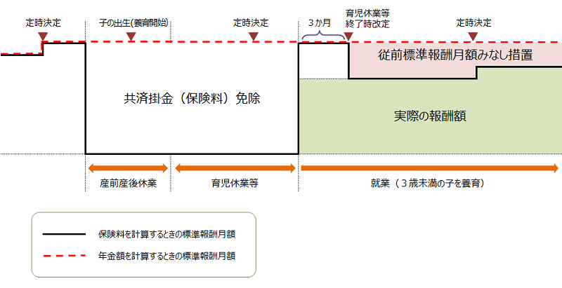 子の出生の前月の標準報酬月額を基準として、子が3歳に達するまでの養育期間中に標準報酬月額が低下した場合、養育期間中の報酬の低下が将来の年金額に影響しないよう、年金額が計算される制度です。3歳未満の子を養育していれば、男女を問わず適用対象となります。